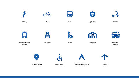 Our team developed a series of pictograms intended to be used in conjunction with our selected font in order to provide relevant information to a wider audience without the constraints of language. UT is a school full of a diverse range of students with varying backgrounds and cultures. It is also located in a city which is very diverse in and of itself. Not everyone who attends or visits UT speaks the same language or has the same experience level with American wayfinding systems. We needed to be able to communicate with something other than words.