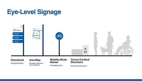 In order to standardize potential ground signage formats, I was tasked with creating plans for how ground signage would be arranged and placed at predetermined locations. This consistency in placement makes it easier for pedestrians to quickly identify and use the affordances we have developed for them. These plans included signage locations, diagrams for assumed lines of sight, and diagrams for where people group themselves, or "cluster", while waiting to cross at crosswalks. All of these plans were modeled around a specific intersection which we used to test our physical prototypes.​​